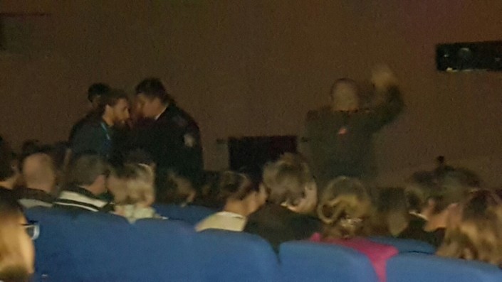 Все пришедшие встали с мест и начали освистывать происходящее и просить хором отпустить мужчину. Отметим, что перед задержанием стражи порядка делали данному зрителю несколько замечаний за то, что он, встав между рядами, танцевал.