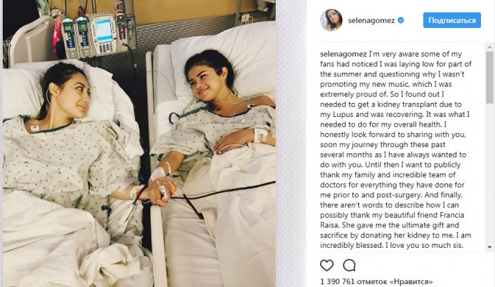 "Она сделала мне бесценный подарок, пожертвовав мне свою почку. У меня нет слов, чтобы описать, как я ей благодарна", - написала Селена Гомес.