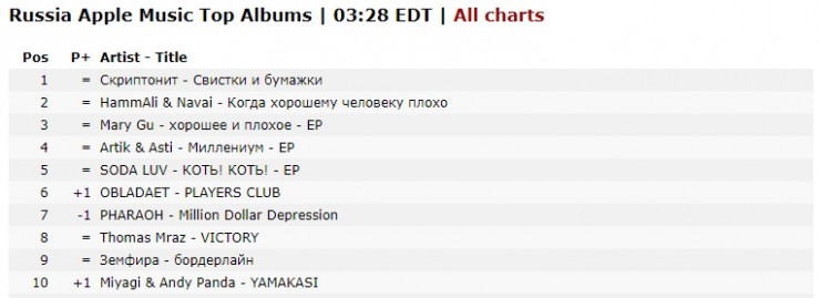 Пять альбомов Скриптонита находятся в топе чарта Apple Music