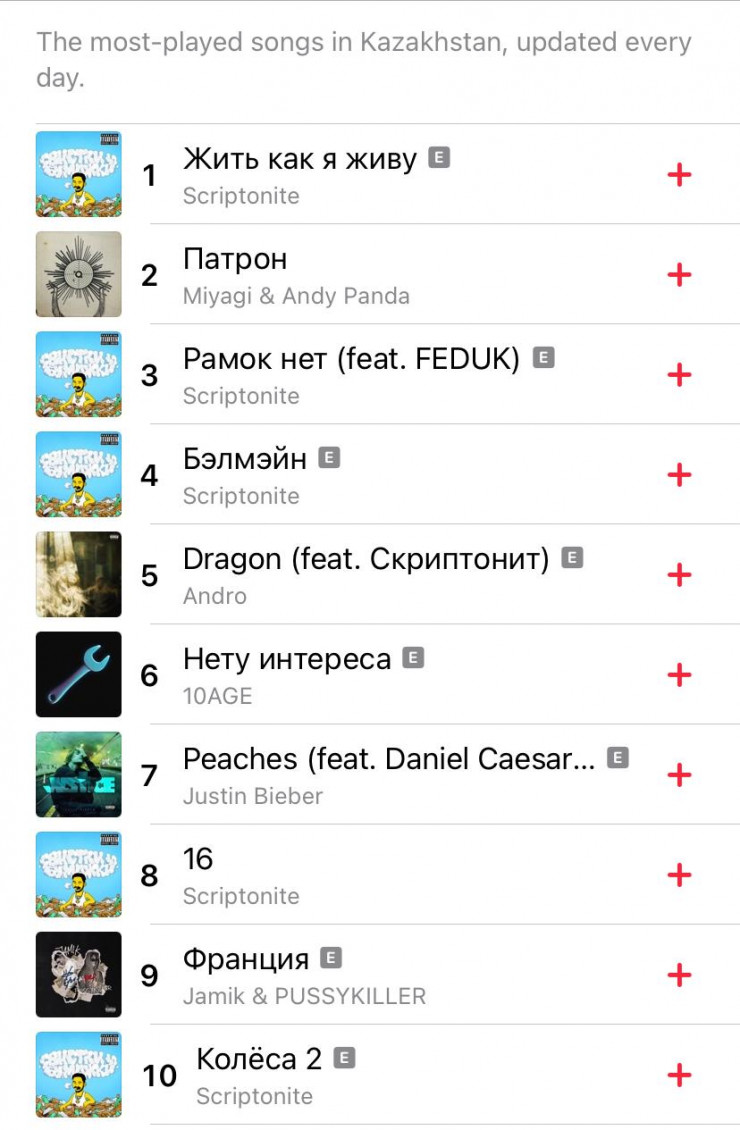 Кроме того, пять песен из нового альбома Скриптонита находятся в десятке самых прослушиваемых песен Apple Music в Казахстане (Top 100: Kazakhstan).