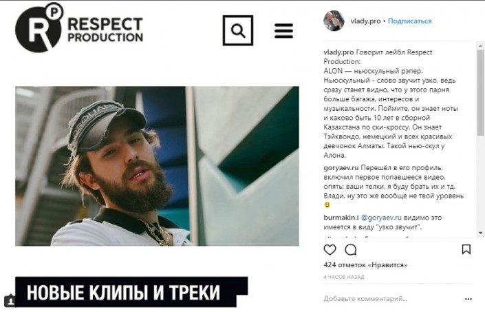 "ALON - ньюскульный рэпер. Ньюскульный - слово звучит узко, ведь сразу станет видно, что у этого парня больше багажа, интересов и музыкальности. Поймите, он знает ноты и каково быть 10 лет в сборной Казахстана по ски-кроссу. Он знает Тэйквондо, немецкий и всех красивых девчонок Алматы. Такой нью-скул у Алона", - такое описание новичка лейба опубликовал у себя в Instagram Влади из Касты.