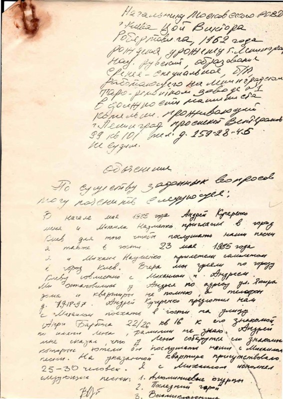 "Начальнику Московского РОВД г. Киева [от] Цой Виктора Робертовича, 1962 года рождения, уроженец г. Ленинграда, национальность русский, образование средне-специальное, б/п, работающего на ленинградском таро-ремонтном заводе № 1 в должности машиниста котельни, проживающий г. Ленинград, проспект Ветеранов 99 кв 101 тел. 1592845, не судим