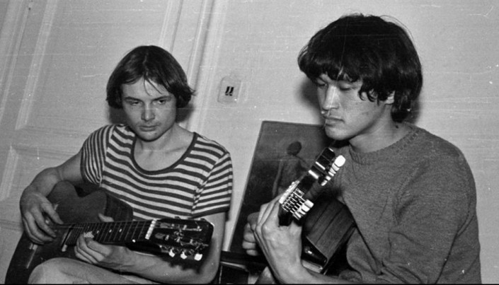 Квартирник. Гитарист, участник первого состава группы "Кино" Алексей Рыбин и Виктор Цой. 1983 год. Фото: Владимир Быстров/Meduza