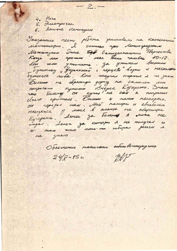 Указанные песни ребята записывали на кассетный магнитофон. Я состою при Ленинградском Международном Доме Самодеятельного Творчества. Когда мы пришли нас было человек 10-12. Мы сели ужинать, за ужином выпили бутылку "Украинской с перцем" водки и несколько бутылок пива. Кто покупал спиртное я не знаю. Билеты на обратную дорогу на самолет мы попросили купить Андрея Кучеренко. Знаю что билет он купил не сам, а попросил своего приятеля. Билеты и наши паспорта он передал нам. Мой паспорт и авиабилет находятся у меня в плаще на квартире Кучеренко. Денег за билет я пока не отдал. Денег за концерт я не получал и о том, что кто-то собирал деньги я не знаю. Объяснение написано собственноручно. 24/V - 85".