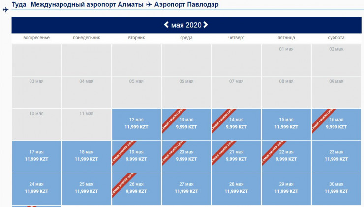 Авиакомпания FlyArystan предлагает билеты на рейс Алматы - Павлодар с 12 мая. Стоимость билетов составит от 9 999 тенге, в зависимости от выбранной даты полета.