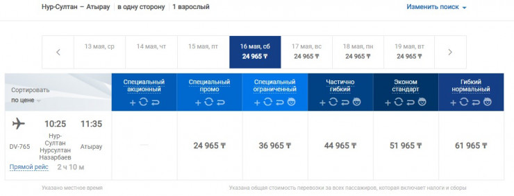 С 16 мая предлагаются билеты на рейс Нур-Султан - Атырау по цене от 24 965 тенге до 61 965 тенге, в зависимости от выбранного тарифа.