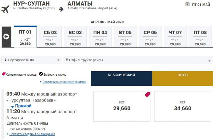 На сайте национального авиаперевозчика "Эйр Астана" сообщается о возобновлении рейсов между Алматы и Нур-Султаном с 1 мая 2020 года, а также других рейсов по стране с 11 мая 2020 года. На 1 мая стоимость билета Нур-Султан - Алматы составляет от 29 660 до 34 660 тенге в зависимости от выбранного тарифа и времени полета. Со 2 мая цены составляют от 20 890 тенге.