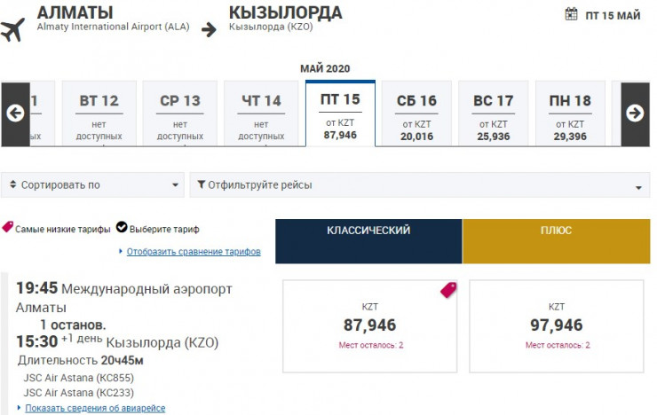 Помимо рейсов Нур-Султан - Алматы, с 15 мая предлагается купить билеты на рейс Алматы - Кызылорда.