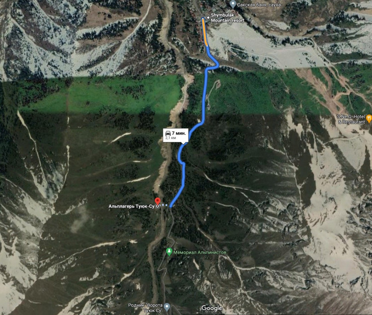 Чтобы добраться до водопада, желательно начать путь с Шымбулака. Идем вверх по дороге, проложенной по Малоалматинскому ущелью. Через примерно два километра, не доходя до Мемориала, у гостиницы "Ворота Туюксу", сворачиваем направо, к Альплагерю Туюк-Су (подробно о нем ниже).