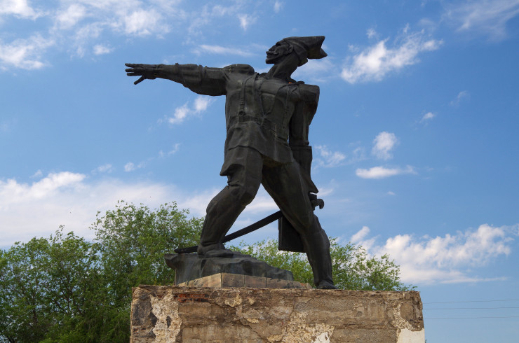Мы посмотрели здание, где располагался штаб группы войск Туркестанского фронта Рабоче-крестьянской Красной армии, руководил которым Чапаев (сейчас здесь располагается музей), увидели весьма своеобразный памятник легендарному комдиву, побывали на том самом утесе, с коего, по легенде, подстрелили уже раненого Чапаева, который пытался спастись, переплывая Урал, а также посетили братскую могилу, где похоронены красноармейцы, погибшие во время так называемого Лбищенского рейда (таково официальное название военной операции Уральской армии, которая закончилась разгромом группы войск Чапаева). А потом была дорога наперегонки с дождевыми тучами, в которой мы почти победили, выехав-таки за пределы грозового фронта туда, где светило уже заходящее солнце.