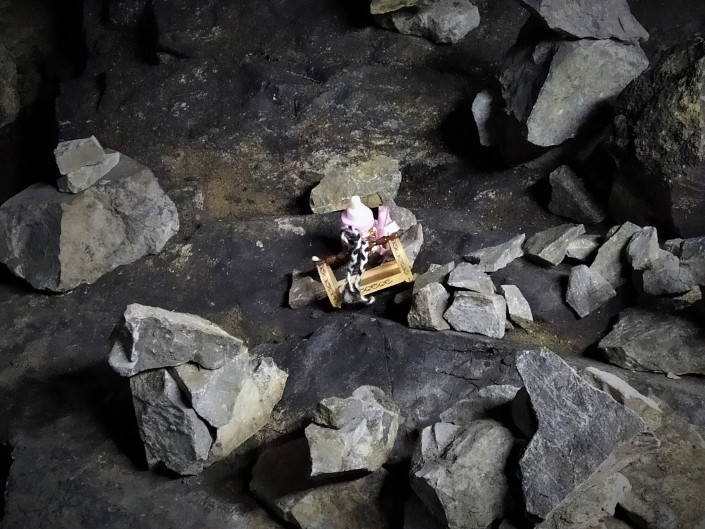 Вход в пещеру и ее основание не всегда были покрыты такими валунами. Когда ее исследовали путешественники в начале ХХ века, то писали, что в пещере ровная поверхность - песчаная, за которой лежит озеро. Эти валуны, лежащие теперь на поверхности, - результат постоянного сотрясения почвы от ядерных испытаний. Проводились они сравнительно недавно в 70 километрах от пещеры. Постоянные искусственные землетрясения приводили к тому, что от верхних сводов пещеры отваливались камни и падали, отсюда такое хаотичное нагромождение под ногами валунов.
