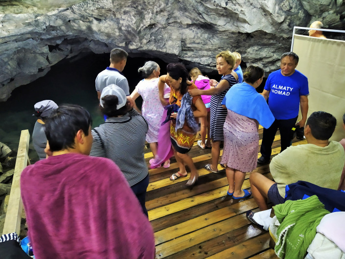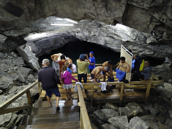 Люди окунаются в воду и сейчас, веря в ее особые целебные свойства. Вода настолько холодная, что конечности может сразу стянуть судорогой и нестерпимо ломит кости ног. Но обряд требует, окунаться в воду нужно не менее трех раз. Желательно семь. Удивительно, но среди туристов мало кто отказывается. Купаются в одежде, и согласно той же традиции одежду эту не сушат. Одежда, как и тело, должны высохнуть сами, дабы впитать в себя все целебные свойства воды. Удивительно то, что за несколько раз посещений этой пещеры мы ни разу не видели заболевших и почувствовавших себя плохо людей. А ведь температура в пещере всего семь градусов, а воды и того меньше, +4. Видимо, самовнушение, поскольку каждый окунающийся в озере идет с мольбами к Всевышнему, загадывает желание и искренне верит, что его мольбы и желания исполнятся.