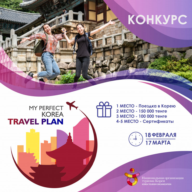 Представительство Национальной организации туризма Кореи в Алматы объявляет конкурс для студентов казахстанских вузов. Название конкурса: "Мой план идеального путешествия в Южную Корею". Цель конкурса - повышение интереса к туризму в Южную Корею и увеличение обмена культурными ценностями между Казахстаном и Кореей.