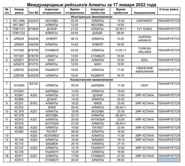 17 января 2022 года запланировано 168 рейсов, из них "Эйр Астана" и Fly Arystan выполнят 111, SCAT – 35, Qazaq Air – 22. Из них с задержкой 4 рейса, 27 рейсов отменено. Основные причины всех задержек и отмен рейсов – регламент работы аэропортов города Алматы, позднее прибытие ВС (цепная реакция).