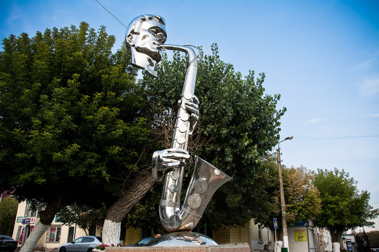 На той же аллее расположена скульптура серебристого цвета - "Саксофонист". Изготовлена она из белого гипса, который дополняет лепнина. Блестящий "Саксофонист" появился здесь в апреле 2011 года.