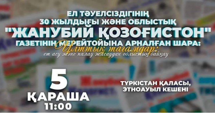 5 ноября в комплексе Этноаул в Туркестане будет очень много интересного. Здесь стартует областной конкурс блюд среди районов, посвященный 30-летию независимости страны и юбилею областной общественно-политической газеты "Жанубий Қозоғистон".