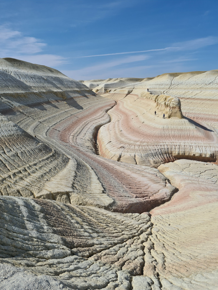 Плато Устюрт раньше было дном древнего океана Тетис. И на нем постоянно происходило скапливание осадков: глина, пески, различные организмы. А потому неудивительно, что в разное время суток пейзажи меняют свои цвета. Днем, в солнечную погоду, пейзаж белоснежный, к вечеру приобретает кремовые оттенки, на закате - багряного цвета.