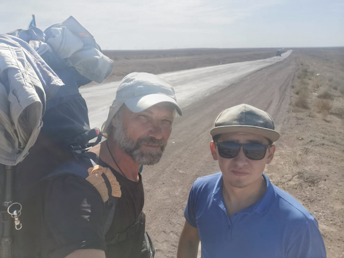 Слышу, кто-то обнюхивает палатку, не стал выходить, а утром обнаружил следы медведя. Любой человек испытывает страх. Другое дело, сможешь ли ты его преодолеть. Я часто шел в ночное время. Посветишь мощным фонариком, а на тебя несколько пар зеленых глаз смотрит. Волки, шакалы. Однажды проснулся, окруженный степными муравьями. Жуть, но когда видишь потрясающее степное небо, звезды, то ты думаешь о чем-то высоком, а не о страхе. Люди встречались хорошие и не очень. Оборудование чуть не присвоили. Бывало иногда, что не туда тебя направят. Но мне бы не хотелось говорить о негативных моментах. Чаще встречались добрые, всегда угощали, воды подавали. У меня много фотографий с теми, кого встречал в пути.", - продолжил путешественник.