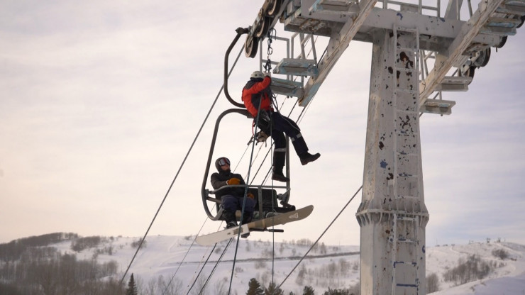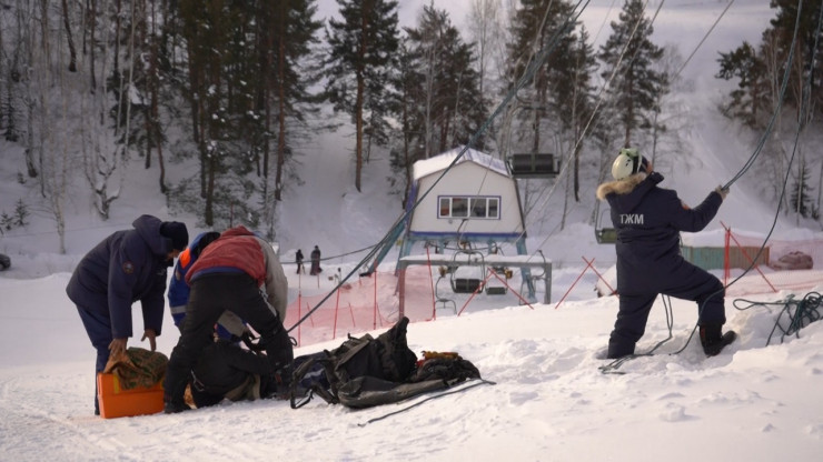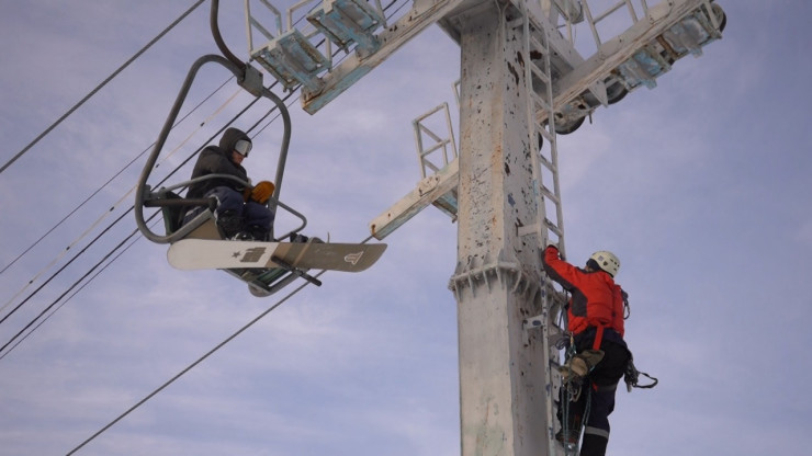 Для обучения туристов основам безопасности спасатели ДЧС провели на одной из баз отдыха практические занятия. По легенде двое сноубордистов застряли на высоте на горнолыжном подъемнике, который остановился вследствие технической неисправности.
