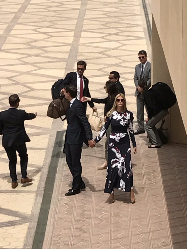 При этом первая леди Америки и ее дочь приехали на встречу в консервативной одежде, учитывая дресс-код в мусульманской стране. Меланья была одета в костюм-комбинезон с золотым широким поясом, который полностью закрывал руки и ноги. На Иванке было длинное черное платье с красно-белым цветочным рисунком и длинными рукавами.