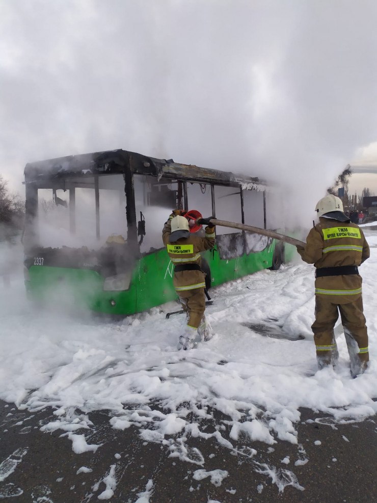 В ДЧС Алматы сообщили, что в 8:27 пожарные выехали на вызов на угол улиц Толе би и ВОАД, где они обнаружили горящий автобус ЛиАЗ с площадью горения в 25 квадратных метров. В момент возгорания в салоне не было пассажиров.