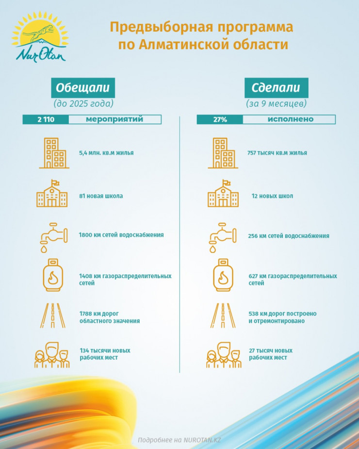 Так, озвученная Главой государства Касым-Жомартом Токаевым предвыборная программа "Путь перемен: Достойную жизнь каждому!" до 2025 года уже исполнена по Алматинской области на 27 процентов. Введено 757 тысяч квадратных метров жилья, 12 школ, построено и отремонтировано 538 километров дорог, создано 27 тысяч постоянных рабочих мест и другое", - подчеркнул он в своем Facebook.