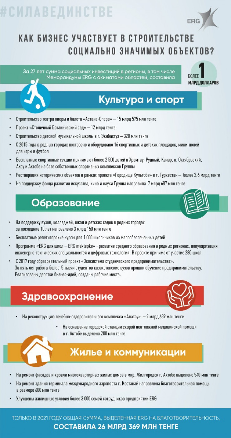 Только в 2021 году общая сумма, выделенная ERG на благотворительность, превысила 26,3 миллиарда тенге.