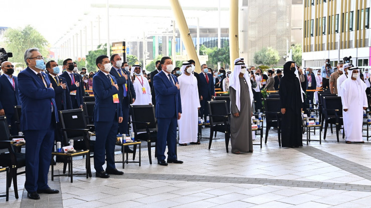 На центральной площади ЭКСПО Аль-Васл Плаза в присутствии премьер-министра Аскара Мамина и министра по вопросам толерантности и сосуществования, генерального комиссара EXPO 2020 Dubai шейха Нахайана бин Мубарака Аль Нахайана проведена церемония поднятия национального флага Республики Казахстан.
