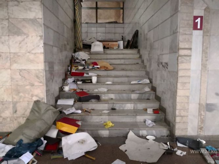 Во всех помещениях царит хаос. Добровольцы со всего Кыргызстана продолжают охранять здание от мародеров.
