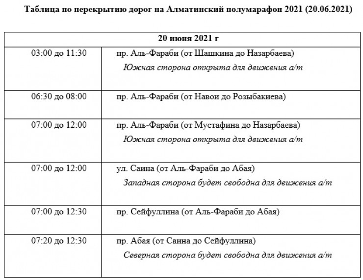 20 июня на время проведения Алматинского полумарафона с 00.00 до 12.30 будет частично перекрыто движение на дорогах в местах прохождения дистанции полумарафона.