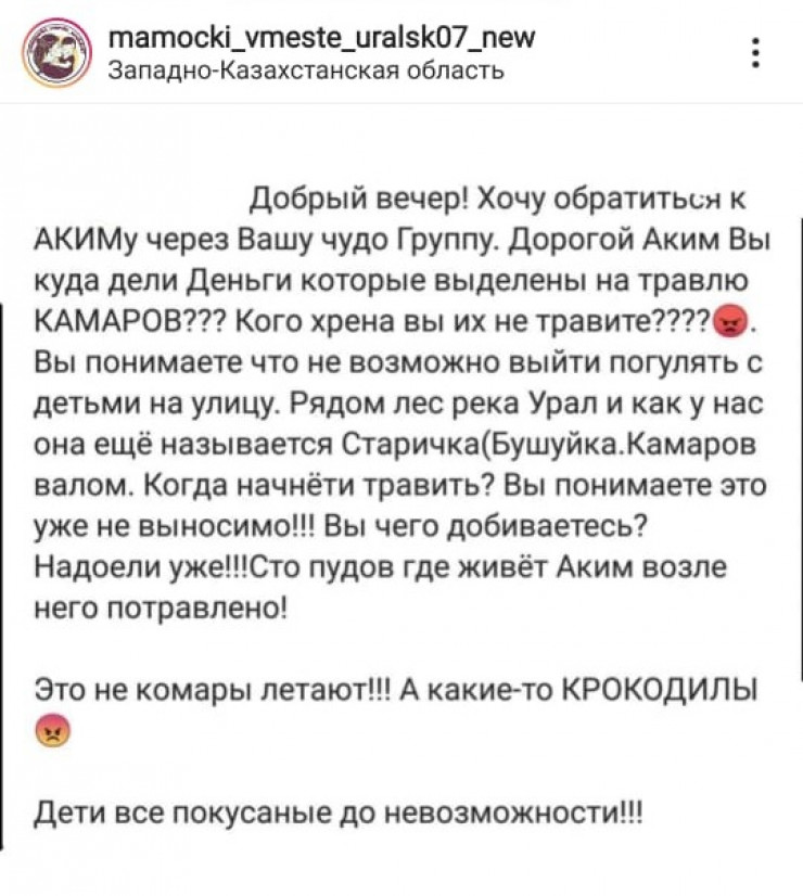 "Мы живем неподалеку от реки Урал. По вечерам выходим погулять с дочкой. Невозможно на улице находиться. Комары облепляют руки и ноги, девочка вся искусана. Куда делись миллионы, которые выделены на обработку от гнуса? Спецтехника ездит просто так", - отметила жительница города Татьяна Симонова.