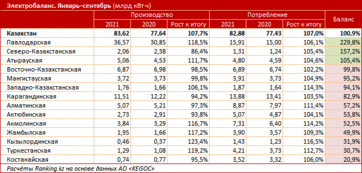 Всего три региона в Казахстане - энергоизбыточные (Атырауская, Павлодарская и Северно-Казахстанская области). Остальные регионы являются энергодефицитными, причем во многих из них потребление превосходит производство многократно.