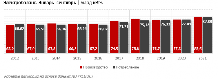 За три квартала этого года производство электроэнергии в Казахстане составило 83,6 миллиарда киловатт-часов - на 7,7 процента больше, чем годом ранее. Потребление выросло на семь процентов, до 82,9 миллиарда киловатт-часов, передает Tengrinews.kz со ссылкой на на Ranking.kz.