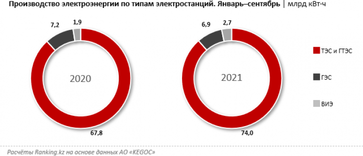По итогам 9 месяцев 2021 года распределение производства электроэнергии выглядит следующим образом: 88,5 процента приходится на тепловые и газотурбинные электростанции (74 миллиарда киловатт-часов, плюс 9,2 процента за год), 8,3 процента - на гидроэлектростанции (6,9 миллиарда киловатт-часов, минус 3,4 процента за год), 3,2 процента - на объекты ВИЭ (2,7 миллиарда киловатт-часов, сразу плюс 44 процента за год). Заметим, доля объектов ВИЭ за год заметно выросла (в аналогичном периоде 2020 года - 2,4 процента) и в целом в последние годы планомерно увеличивается.