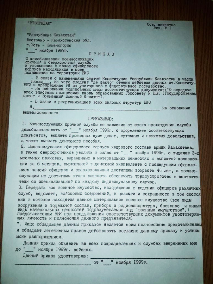 Во время задержания группировки оперативники изъяли документы, которые планировалось предать гласности в случае успешного проведения акции. В штабе у Казимирчука уже были готовы "Акт о передаче на территории ВКО всех властных полномочий ставленниками центральной власти Казахстана представителям народа, населяющего ВКО", "Приказ о демобилизации военнослужащих срочной и сверхсрочной службы и увольнении в запас офицерского корпуса, находящегося в моем подчинении на территории ВКО".