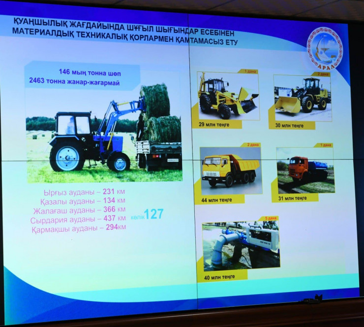 Аким области поручила чиновникам в срочном порядке дополнительно организовать разработку водных скважин, необходимых для водопоя, провести очистку русла каналов, организовать работу по стабилизации цен на сено, ввести в эксплуатацию водовод из бюджета района, а также приобрести насосы и спецтехнику при условии поддержки из республиканского бюджета.