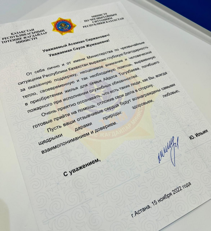 12 ноября представители ТОО "Фирма Азия" и депутат областного маслихата Асемхан Доскужанов вручили ключи от 3-комнатной квартиры супруге и детям покойного Айдоса Тогузбаева в одном из жилых домов микрорайона Карагайлы в городе Семее и поздравили их с новосельем.