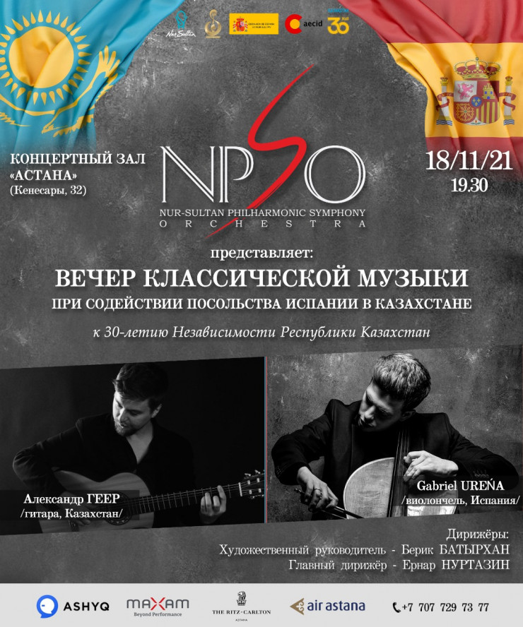Симфонический оркестр Государственной академической филармонии имени Еркегали Рахмадиева во главе с художественным руководителем Бериком Батырханом и главным дирижером Ернаром Нуртазиным исполнит музыку казахстанских и испанских композиторов: Праздничную увертюру Газизы Жубановой, Концерт для гитары с оркестром Aranhues Хоакино Родриго (гитара – Александр Геер), фрагмент из балета El Amor brujo Мануэля де Фальи, а также Концерт № 1 для виолончели и оркестра Камиля Сен-Санса (виолончель − Габриэль Уренья).