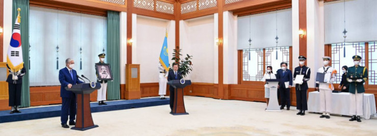 Токаев передал президенту Мун Чжэ Ину шкатулку с землей с места захоронения Хон Бом До и другие памятные предметы, связанные с его биографией.