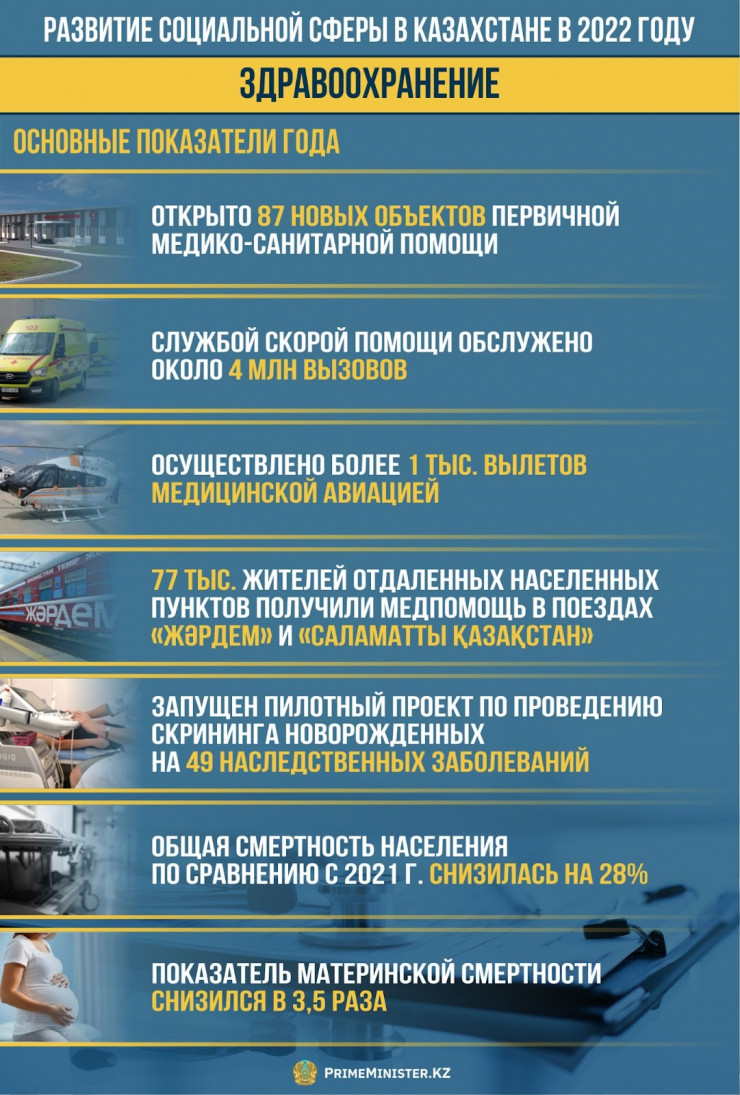 В этом году открыты 87 новых объектов первичной медико-санитарной помощи, среди которых четыре поликлиники, пять центров первичной медико-санитарной помощи, 24 врачебные амбулатории, 11 фельдшерско-акушерских пунктов и 43 медицинских пункта. Большая часть этих объектов была открыта в сельской местности. При этом заработали два новых стационара в Мангистауской области, 72 аптечных пункта на базе медорганизаций и 161 аптека на селе.