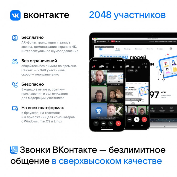 "Мы продолжаем совершенствовать технологии видеокоммуникаций, чтобы предоставить всем пользователям "ВКонтакте" возможности онлайн-общения без каких-либо ограничений. Для этого мы полностью перестроили архитектуру платформы видеозвонков и реализовали новый подход в работе с видео- и аудиопотоками: научились масштабировать звонок на любое количество серверов и потреблять при этом минимум ресурсов — как серверных, так и клиентских. Это позволит нам в ближайшее время стать первыми в мире, кто предоставит технологию подключения к звонку неограниченного числа пользователей с полноценным участием в конференции — с видео и возможностью говорить. Среди нововведений функции как для участников, так и для организаторов звонка: собственная технология демонстрации экрана в сверхвысоком качестве 4К, обновленное интеллектуальное шумоподавление и зал ожидания для управления составом участников. Совсем скоро мы представим новые способы социальной коммуникации — доступ к контенту и совместное потребление во время онлайн-звонка. Сейчас главное для нас — предоставить людям с любыми устройствами и интернет-соединением высокотехнологичный, качественный и абсолютно бесплатный продукт", - отметил технический директор "ВКонтакте" и единой платформы видео и звонков Mail.ru Group Александр Тоболь.