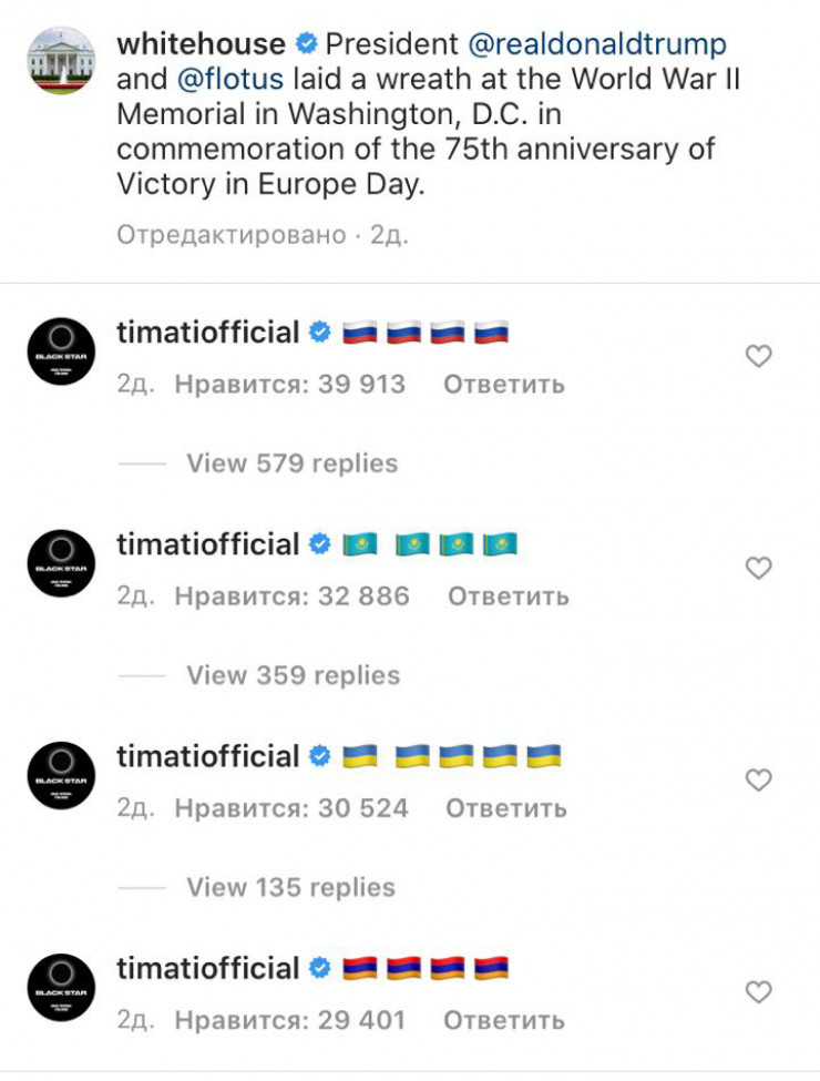 "Красавцы". Победили во Второй мировой, блокадный Петербург отстояли, под Сталинградом битву прошли и флаг на Рейхстаге свой водрузили. Ребят, вы лучшие", - написал Тимати.