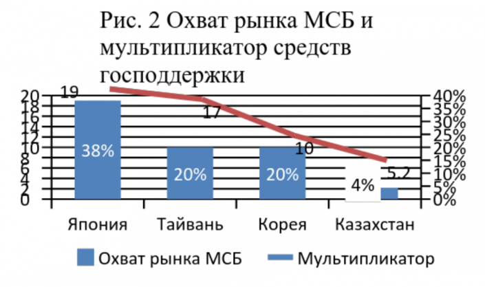 Для заемщиков ключевыми ограничениями выступают дороговизна кредитов и отсутствие залогов. В условиях стагнации экономики и снижения цен на недвижимость эти вопросы стали особенно остры. В принципе, государство пытается решать эти вопросы для приоритетных секторов экономики (МСБ, обрабатывающая промышленность) через субсидирование процентных ставок и развитие системы гарантий. Очевидно, что необходимо менять приоритеты и инструменты оказываемой поддержки. Ситуация, когда, например, фонд поддержки предпринимателей "Даму" из 333,8 миллиарда тенге 60 процентов размещает на обусловленных депозитах с мультипликатором в 1,3 раза, а на гарантии с мультипликатором в 4 раза выше лишь 3 процента средств, свидетельствует либо о непрофессионализме, либо о непонятной обществу мотивации. Для отечественного бизнес-сообщества это выливается в то, что охват программами гарантирования кредитов у нас порядка пяти раз ниже таких лидеров, как Корея, Тайвань, или в девять раз ниже Японии (рисунок 2). При правильном распределении имеющихся ресурсов и использовании новых инструментов (например, секьюритизации кредитов) это отставание можно сильно сократить, по ходу и существенно увеличив темпы роста экономики в целом.