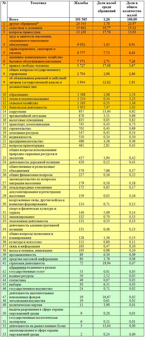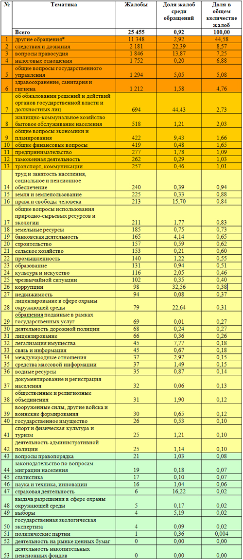 Так вот, ниже представлены таблицы с жалобами физических и юридических лиц в 2013 году. Они такие подробные, потому что именно столько разделов есть при классификации жалоб, ну и чтобы не оставалось никаких сомнений по поводу того, какие именно темы преобладают в жалобах казахстанцев. Также они раскрашены в разные цвета по степени важности проблем.