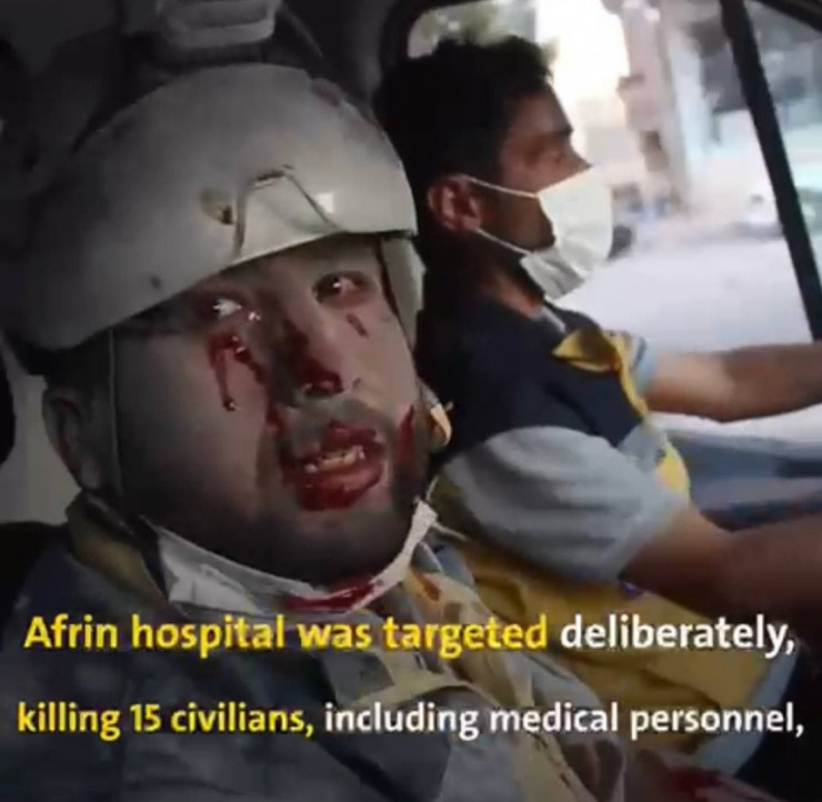 Видео также сообщало о произошедших в зоне Идлиба множестве атак сирийского режима и его союзников, от которых погибли мирные жители. Людей, пострадавших после бомбардировок госпиталей, в кадре спасали, конечно же, "Белые каски", с текущей из раненых глаз кровью.