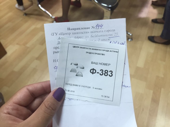 В Центре занятости мне подсказали номер офиса. 2 этаж, 86 бутик. Приняла меня сотрудница по имени Сауле. Ознакомившись в стопке таблиц с вакансиями, женщина записала нужную информацию в лист направления. Хочется отметить доброту Сауле. Человек, который наверняка получает не очень большую зарплату как психолог, выслушала меня, поддержала, поговорила. Далее сотрудница, вручив направление, отправила меня в Центр занятости на Бейбитшилик, 25.
