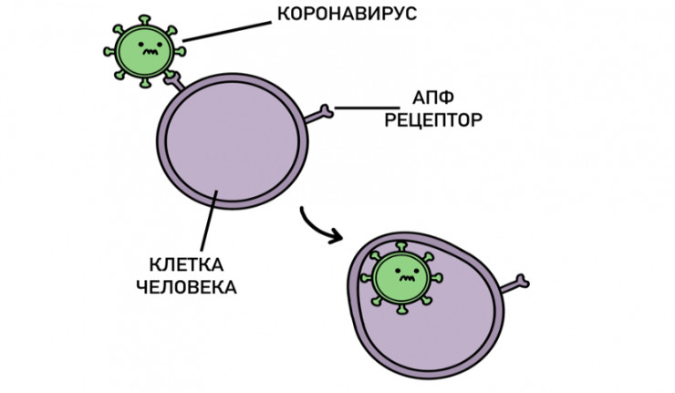 Болезнь начинается с момента, когда коронавирус попадает в организм через дыхательные пути и начинает там размножаться. Для этого он должен с помощью своих шипов прикрепиться к так называемым АПФ-рецепторам, которых много у пожилых людей и у тех, кто страдает хроническими болезнями.