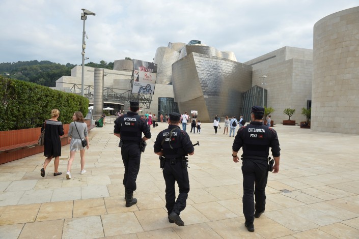 Испанские полицейские во время патрулирования улицы Рамбла и площади перед Музеем Гуггенхайма в Бильбао. Меры безопасности усилены не только в самой Барселоне. Фото REUTERS/Vincent West