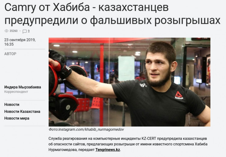 А еще несколько раз казахстанцев хотели обмануть (может, и обманули), используя имя известного российского спортсмена Хабиба Нурмагомедова.