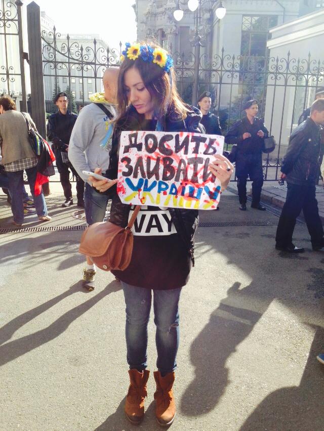 С сооруженной трибуны слышно недовольство митингующих рукопожатием Порошенко с Путиным в Минске. Собравшиеся призывают весь мир признать Россию агрессором. Среди не политических лозунгов - в штаб АТО должны войти те, кто принимал участие в военных действиях. В частности, люди в камуфляже недовольны действиями министра обороны Украины - Валерия Гелетея, который в прошлом не был военным, а работал милиционером.